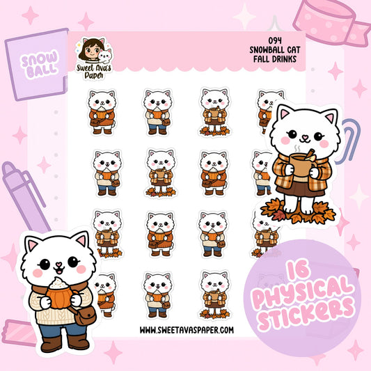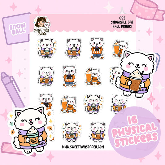 Snowball Cat Fall Drinks Planner Stickers – Physical Kawaii Autumn Coffee & Seasonal Stickers [094]