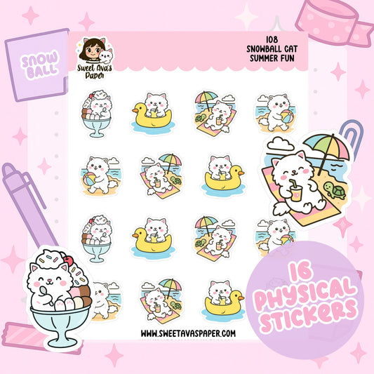 Snowball Cat Summer Fun Planner Stickers – Physical Kawaii Beach & Vacation Stickers for Planners [108]