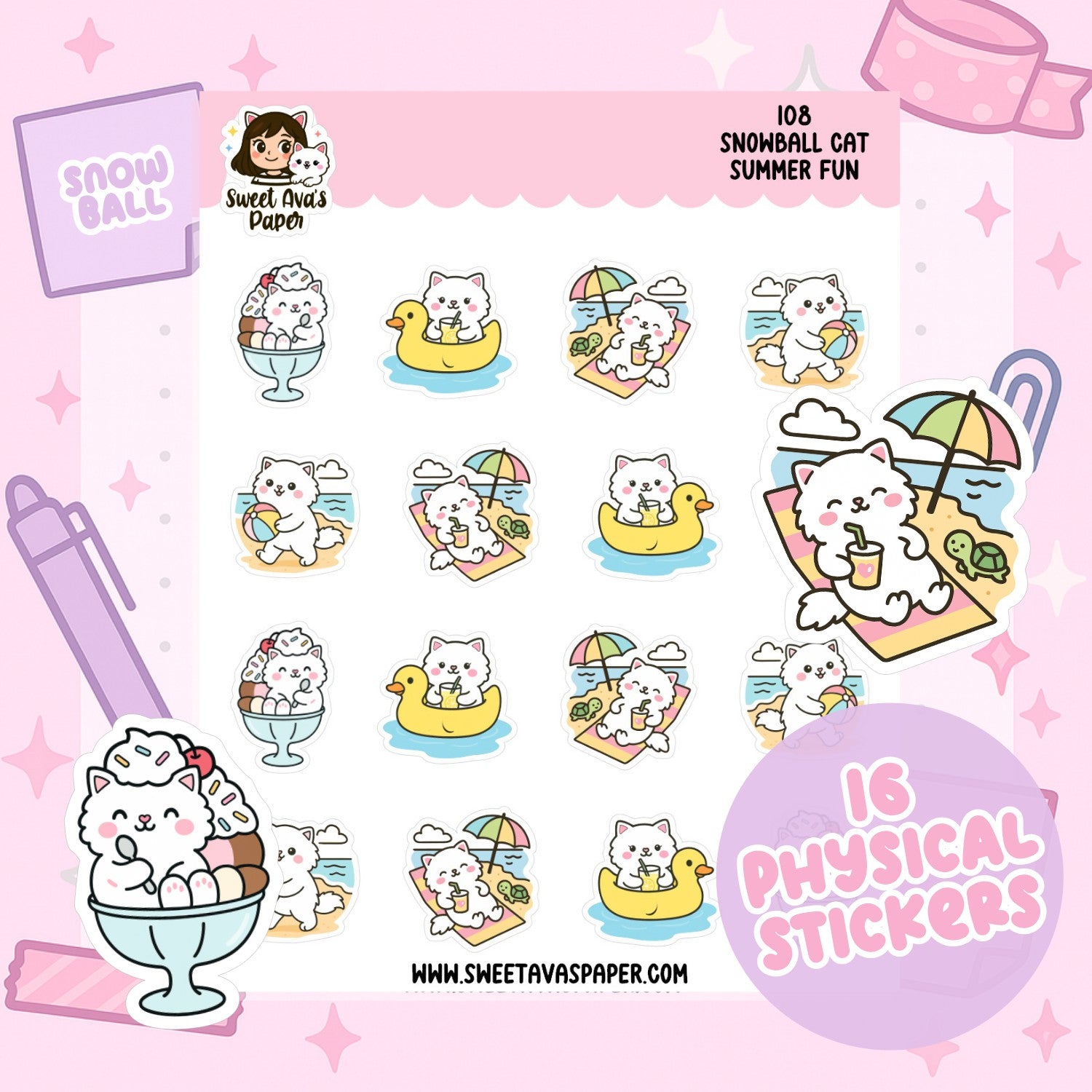 Snowball Cat Summer Fun Planner Stickers – Physical Kawaii Beach & Vacation Stickers for Planners [108]