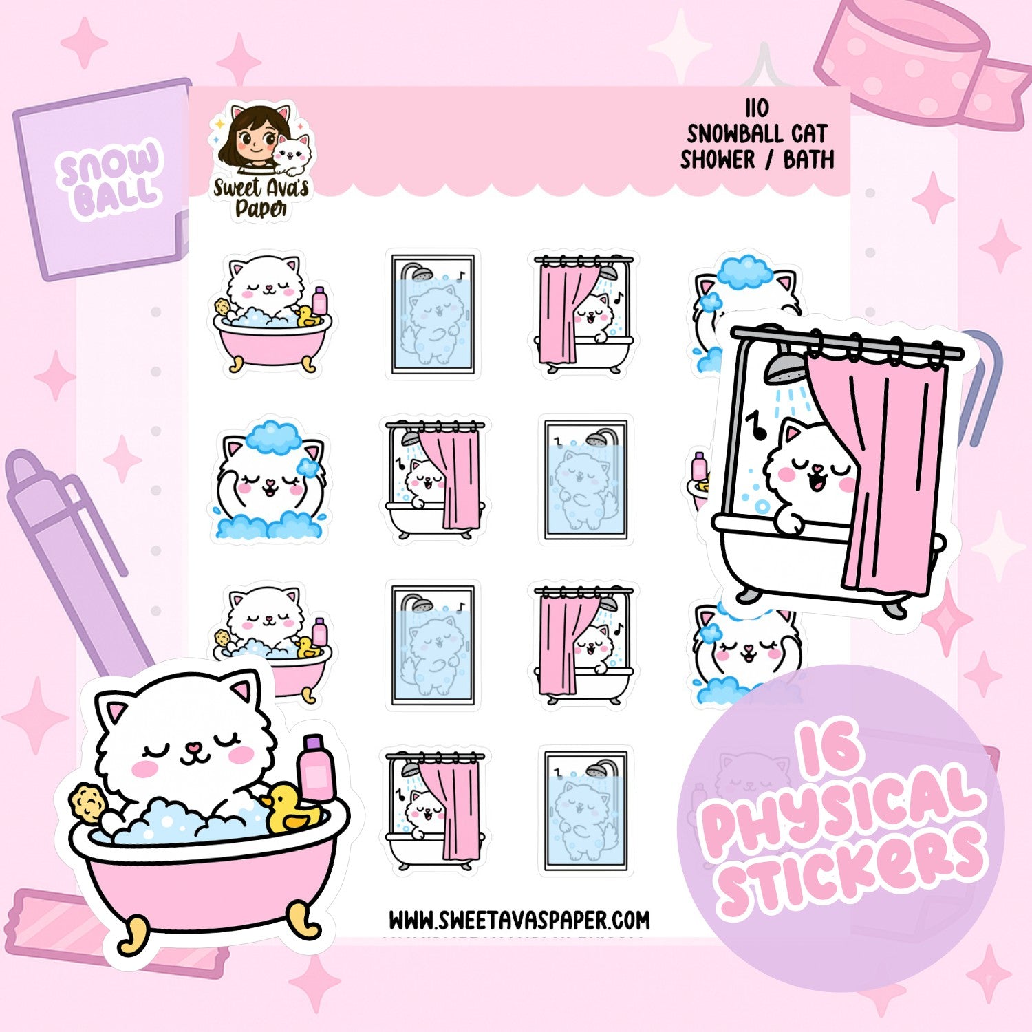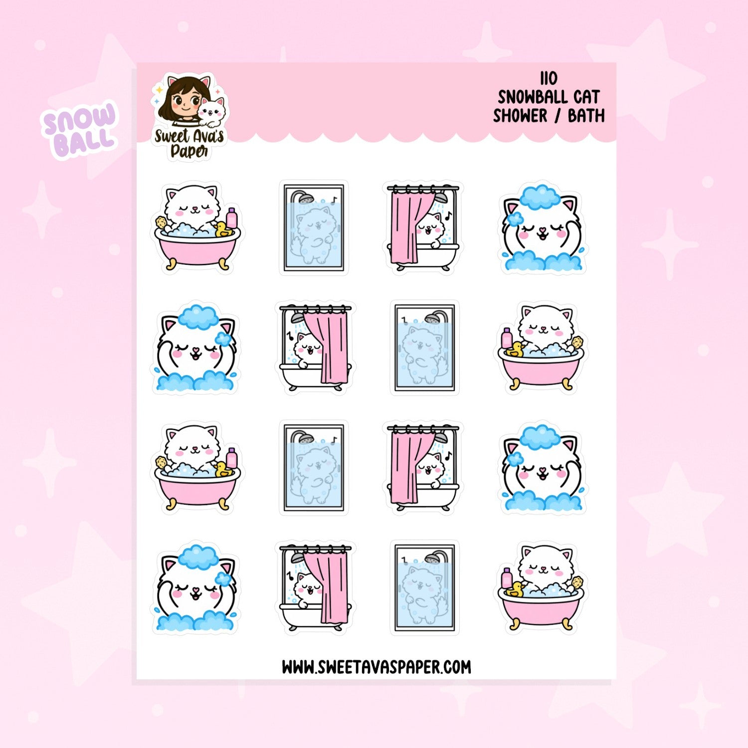 Snowball Cat Shower / Bath Planner Stickers – Physical Kawaii Self-Care Stickers for Planners & Journals [110]